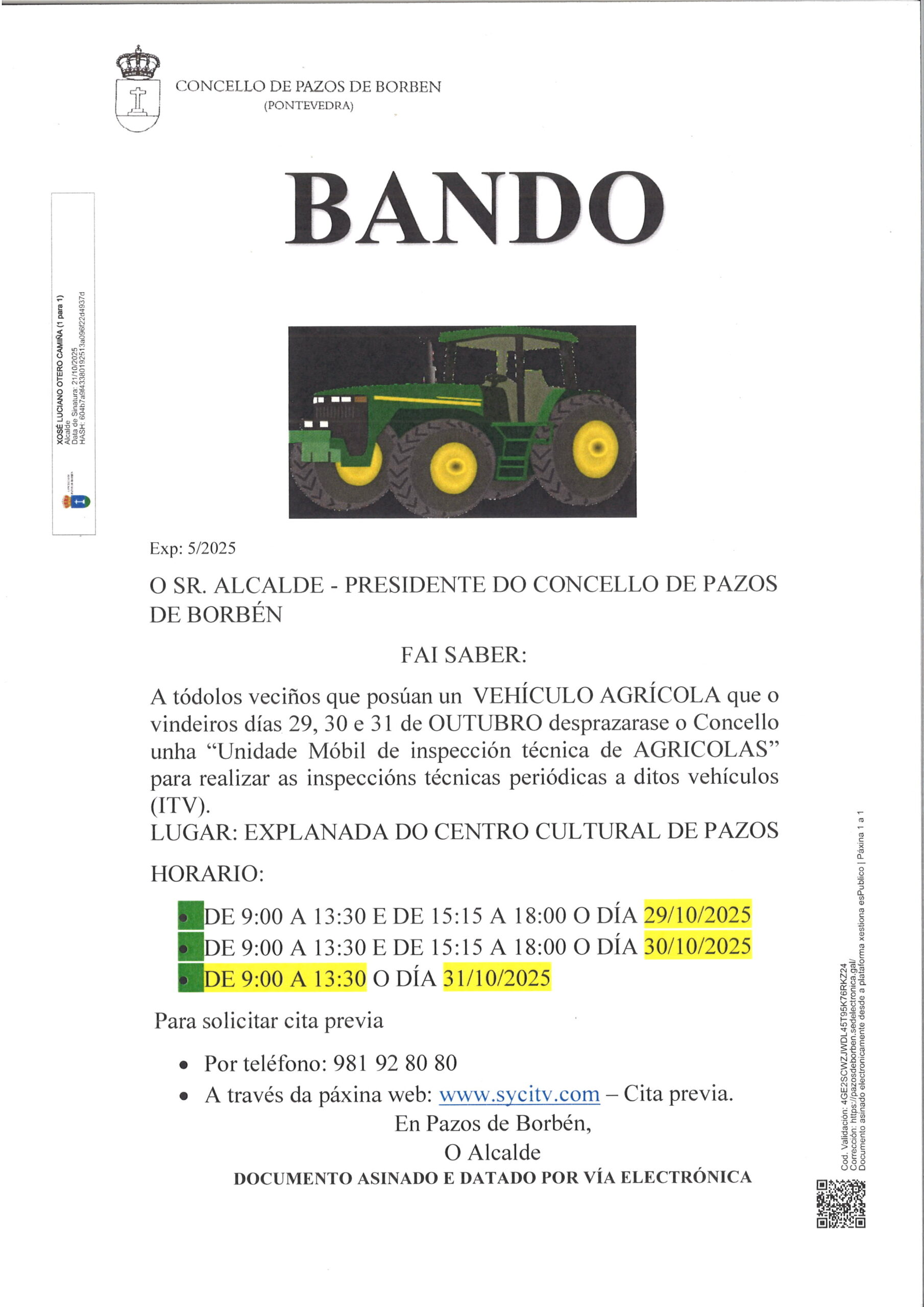 ITV VEHÍCULOS AGRÍCOLAS: 29 E 31 DE OUTUBRO NA EXPLANADA DO CENTRO CULTURAL DE PAZOS